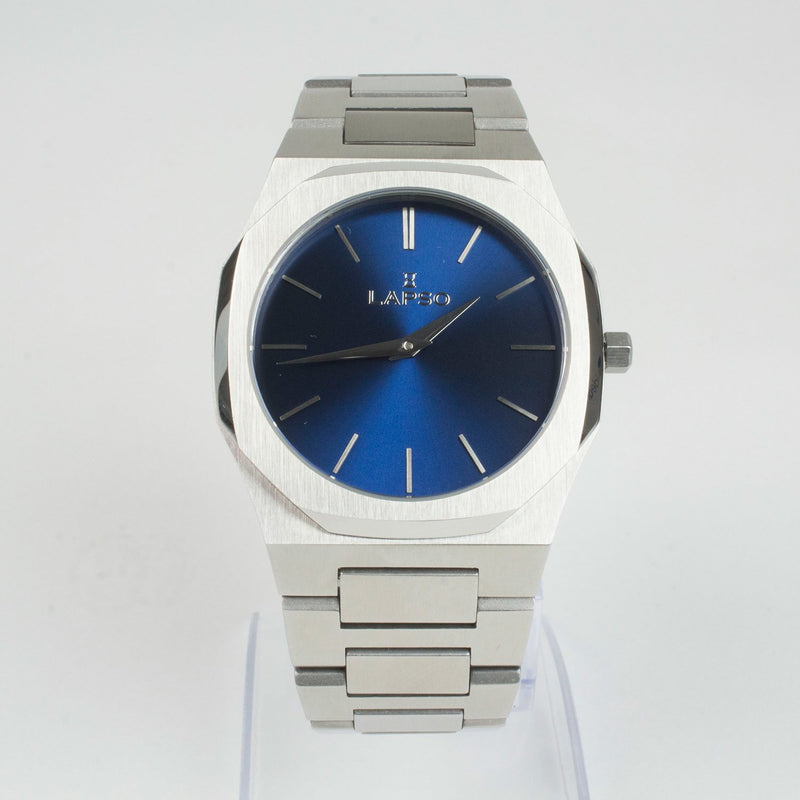 Reloj plateado con 2 manecillas y dial azul